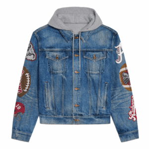 - Crafted from high-quality denim, it features a cozy hood for added warmth and a modern touch.